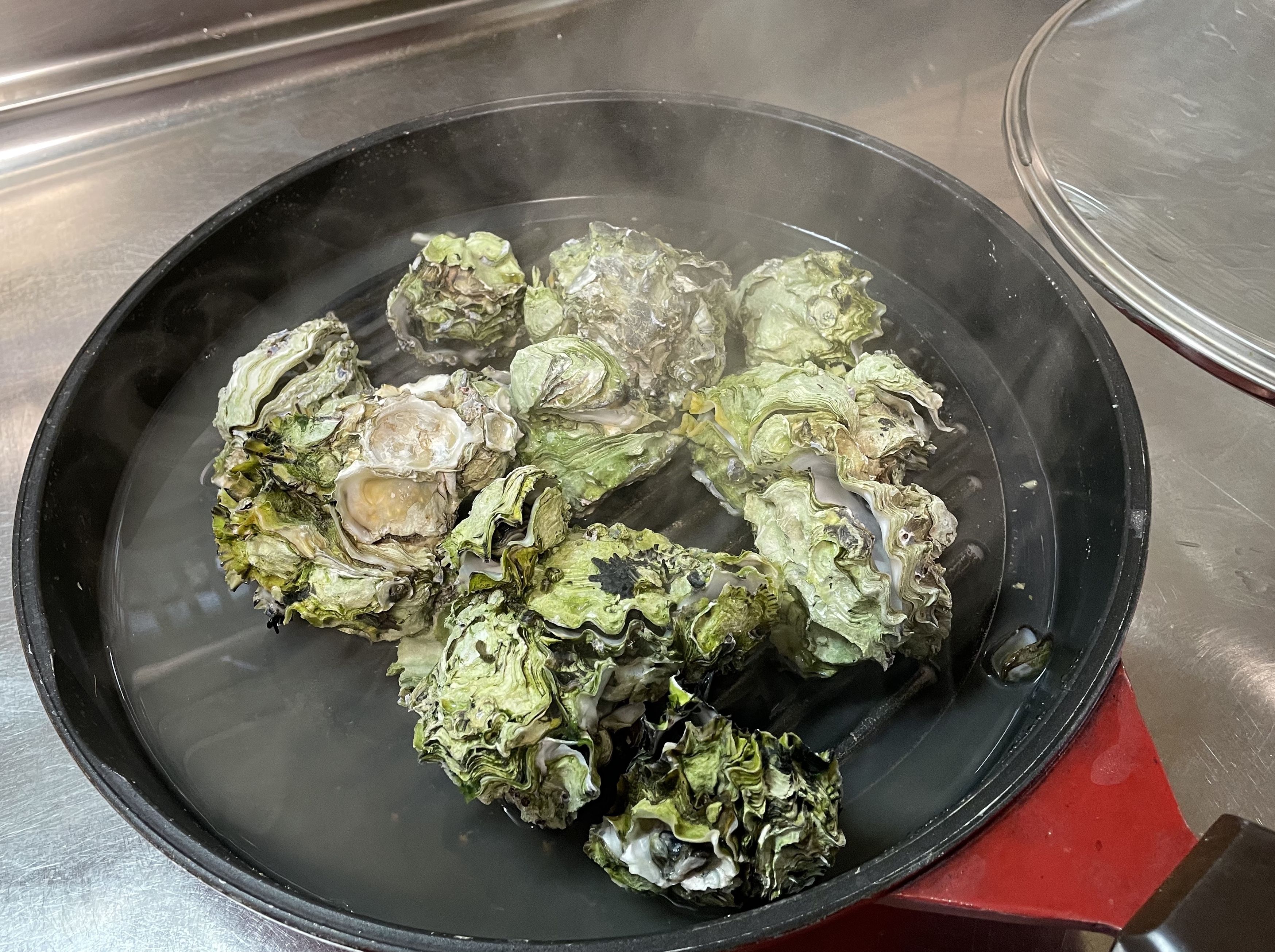 この間に若い人たちも朝食だか昼食を終え、まだ潮が引き切ってないなか牡蠣を採りに小型船で