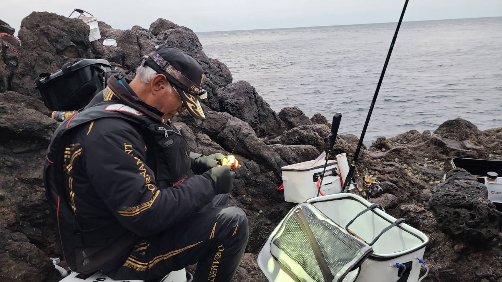 最初は小さなイサキがよく食ってきますが、クロの当たりがなく苦戦していると江藤くんが来て