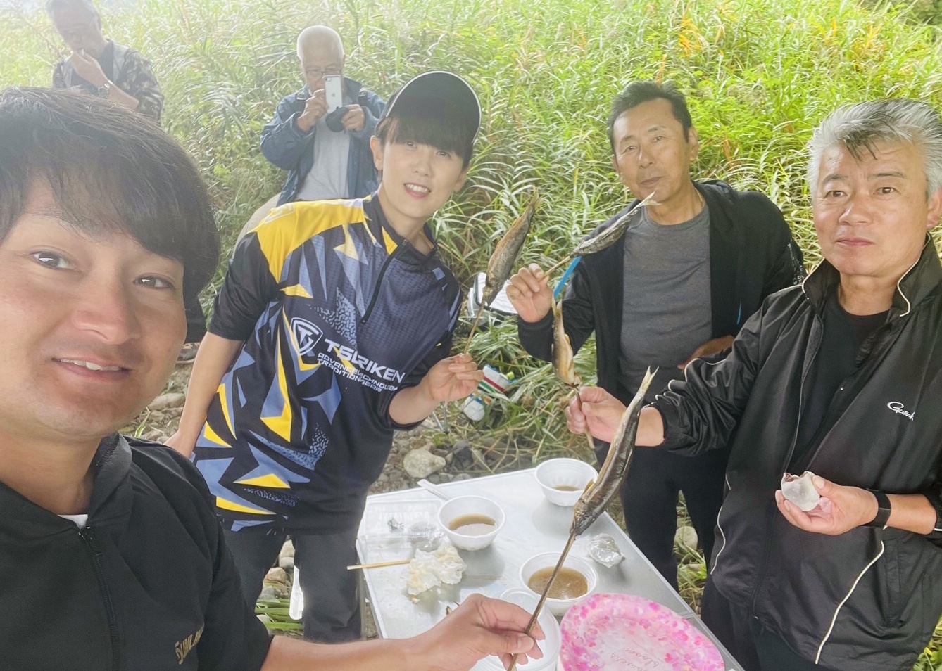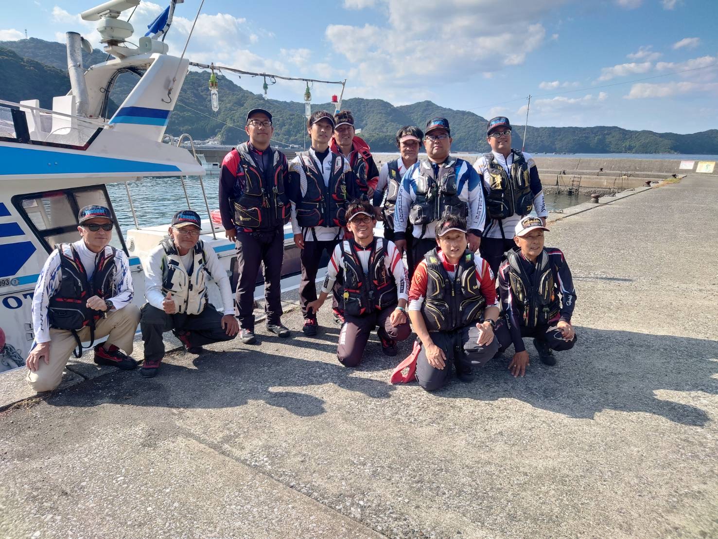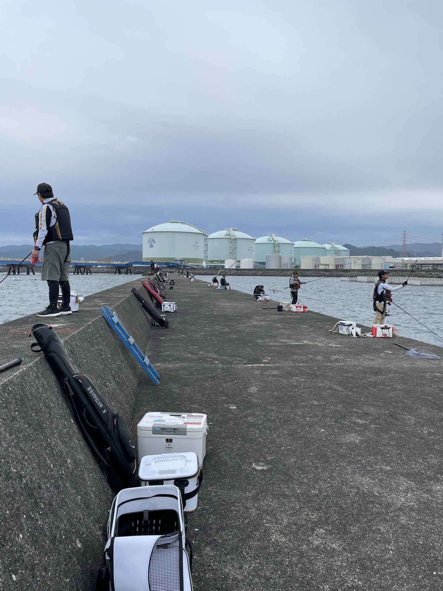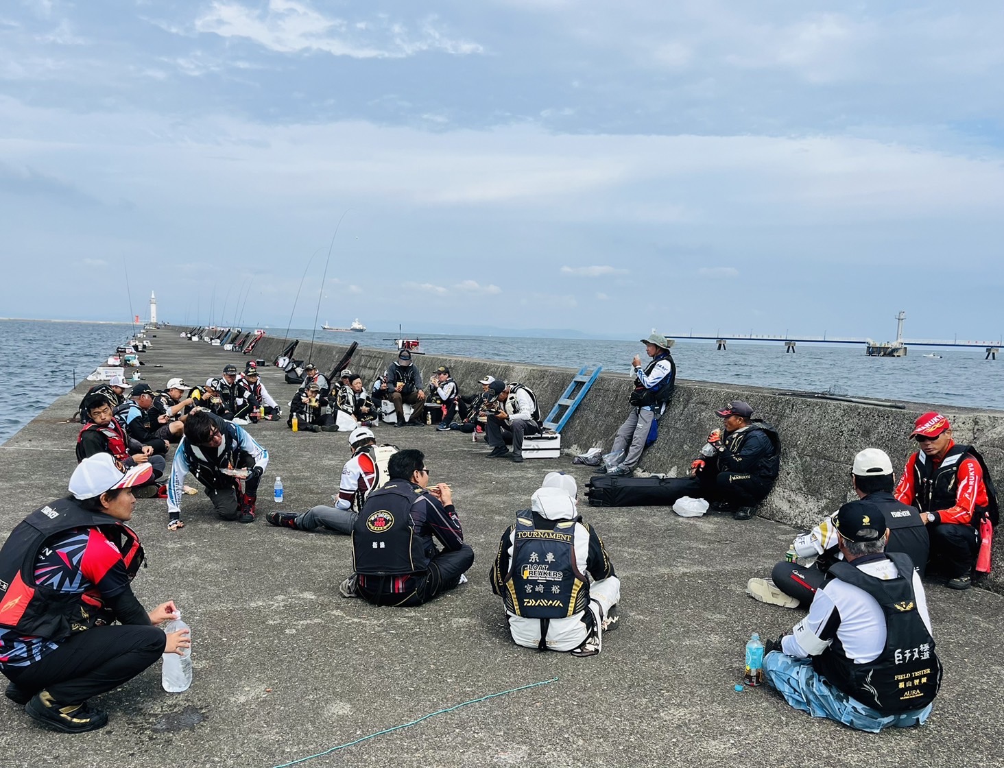 10時から1時間は食事と懇親会で防波堤の中央に全員で集まり、名手たちの仕掛けや