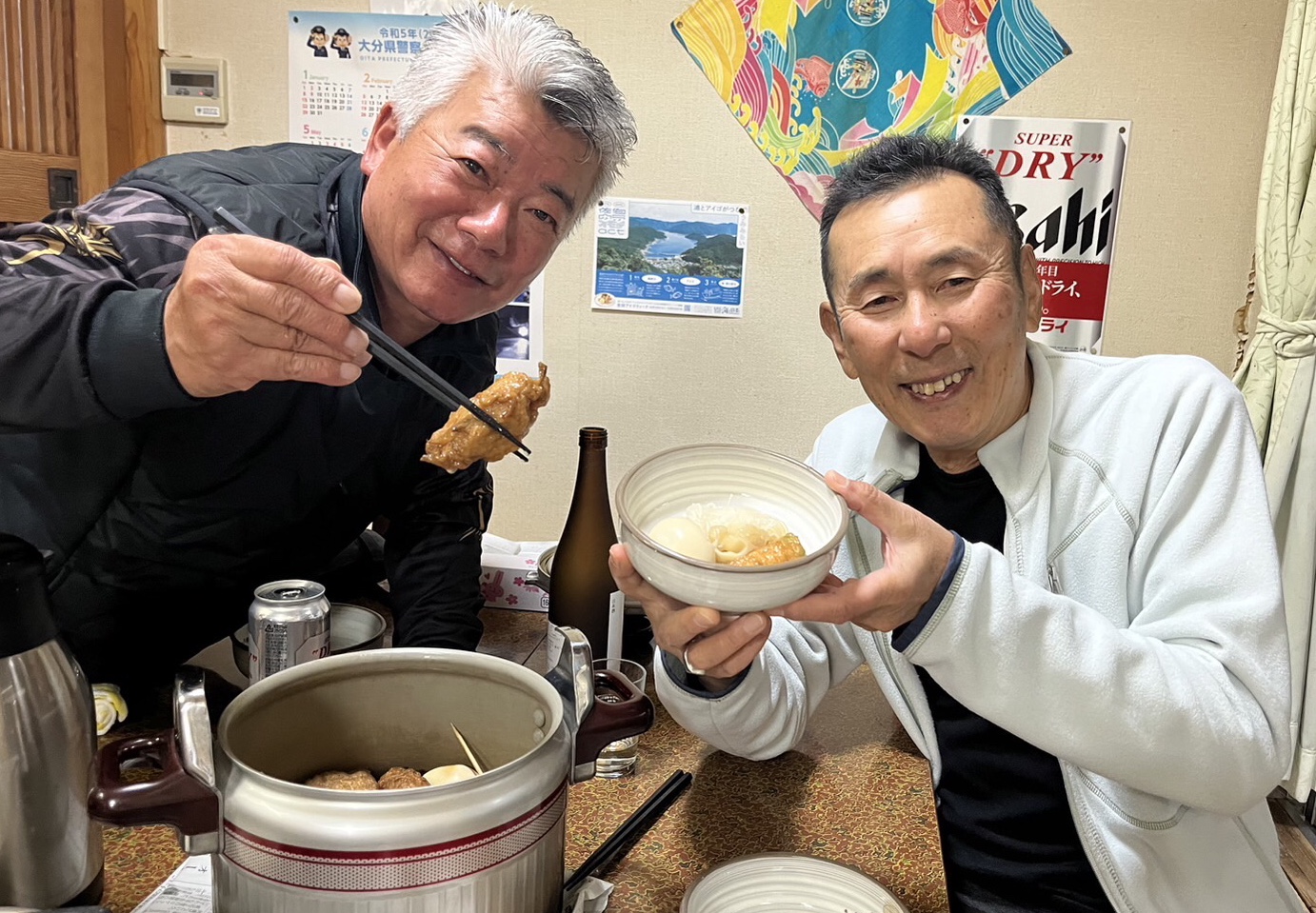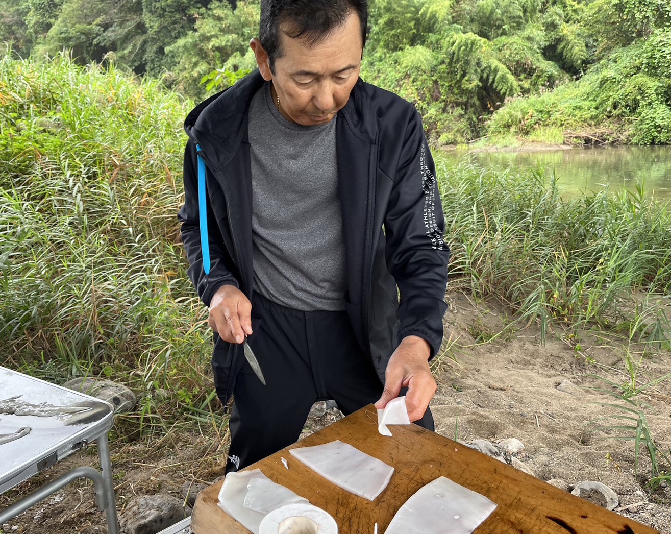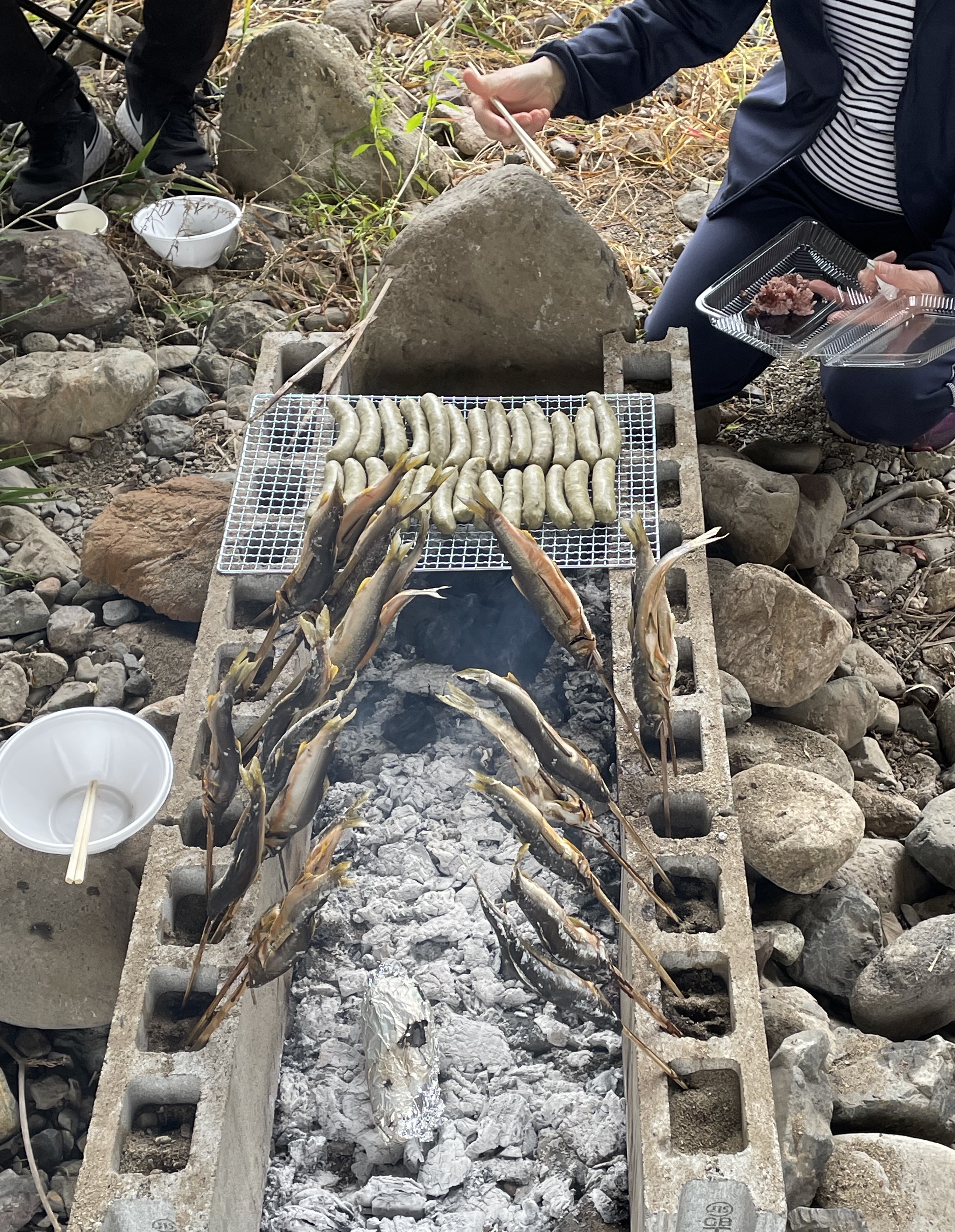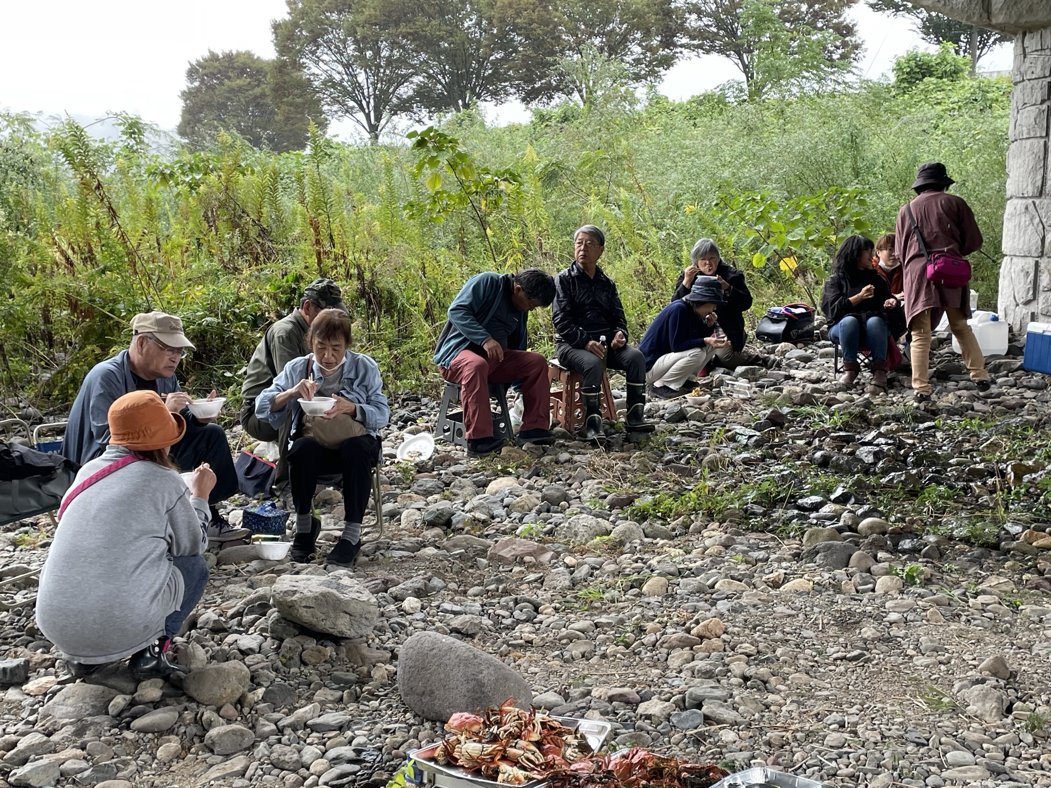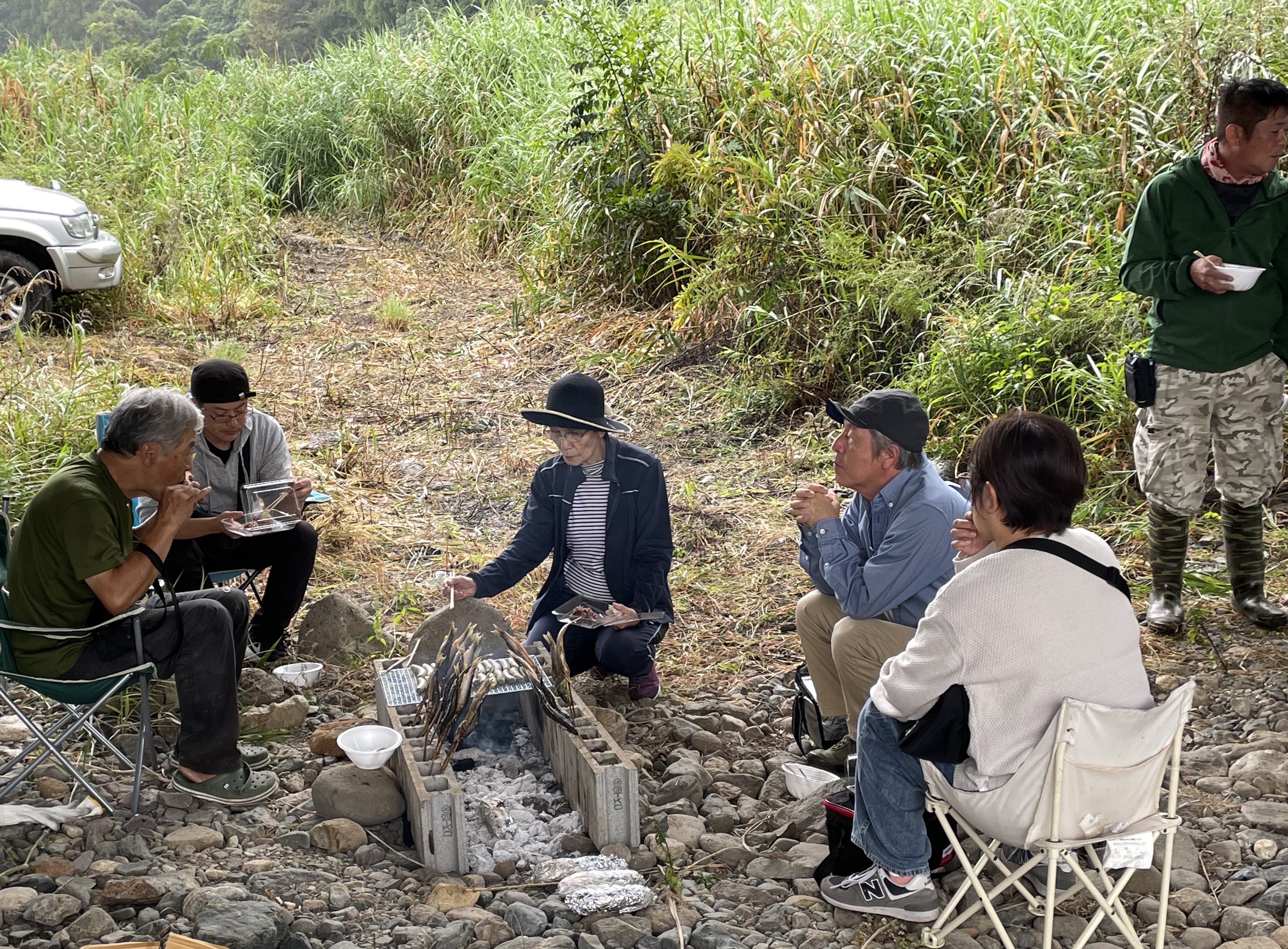 10時から1時間は食事と懇親会で防波堤の中央に全員で集まり、名手たちの仕掛けや