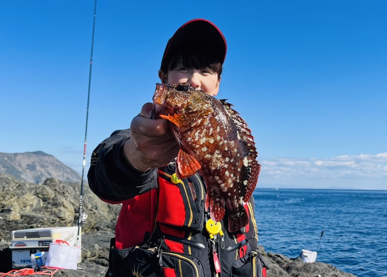 時間になり時折強風に体を飛ばされそうになりながら2人並んで釣りを始め、何と1投目から