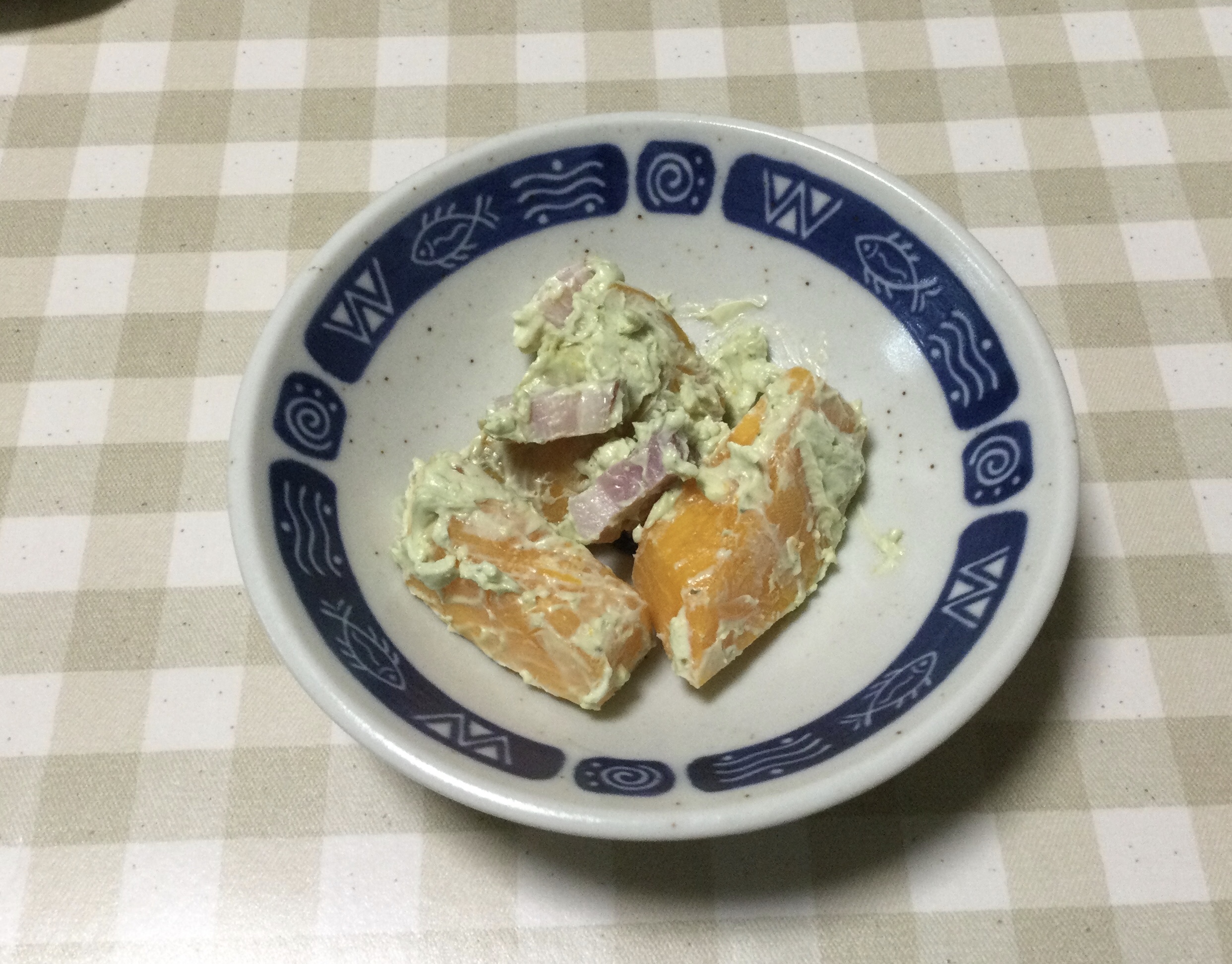 カボチャはチンして柔らかくして、厚切りベーコンとバジルソースとクリームチーズで和えて
