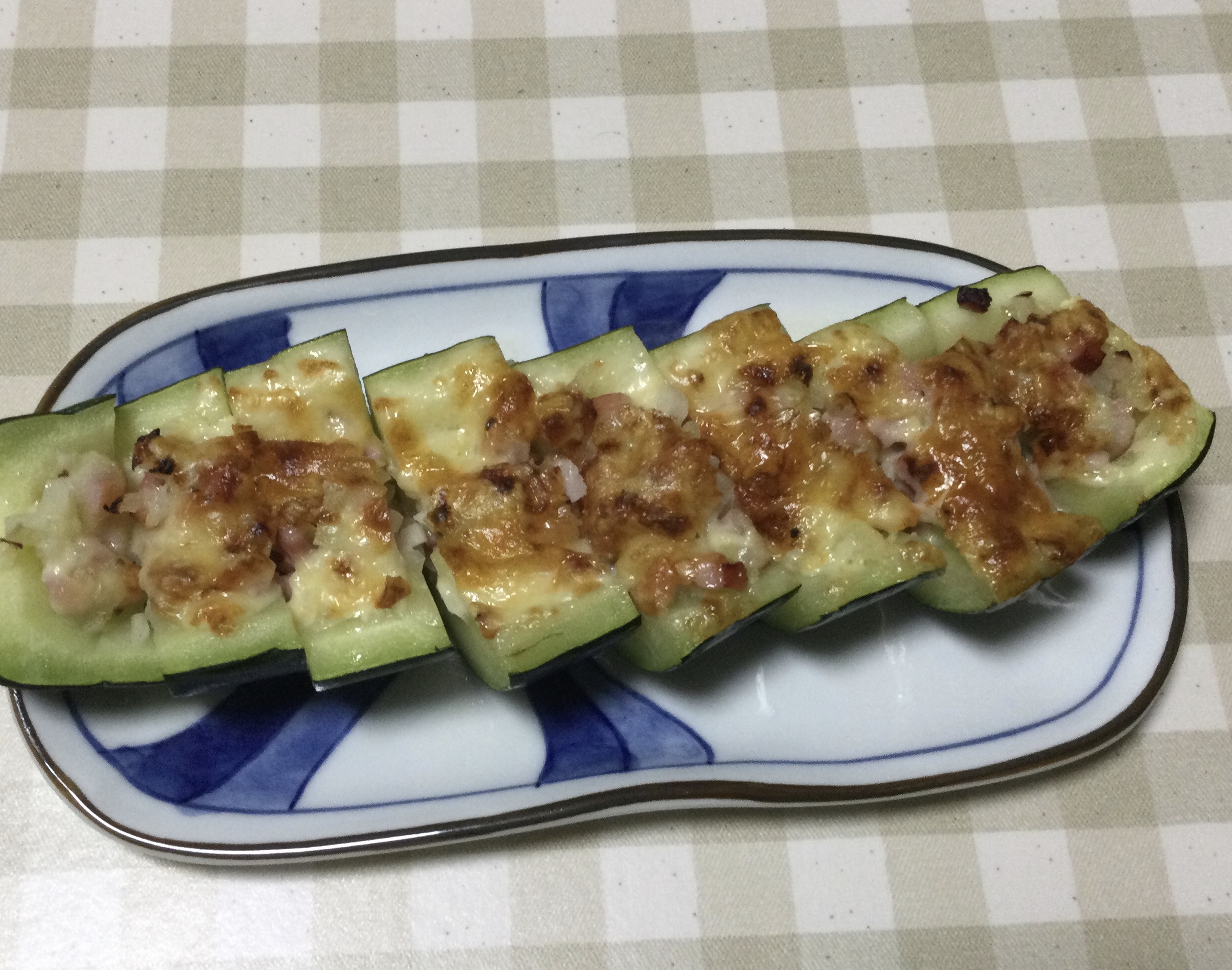 次はズッキーニが大きくなっていたので、種をくり抜いて玉ねぎ、ベーコンを詰めてチーズを乗せ