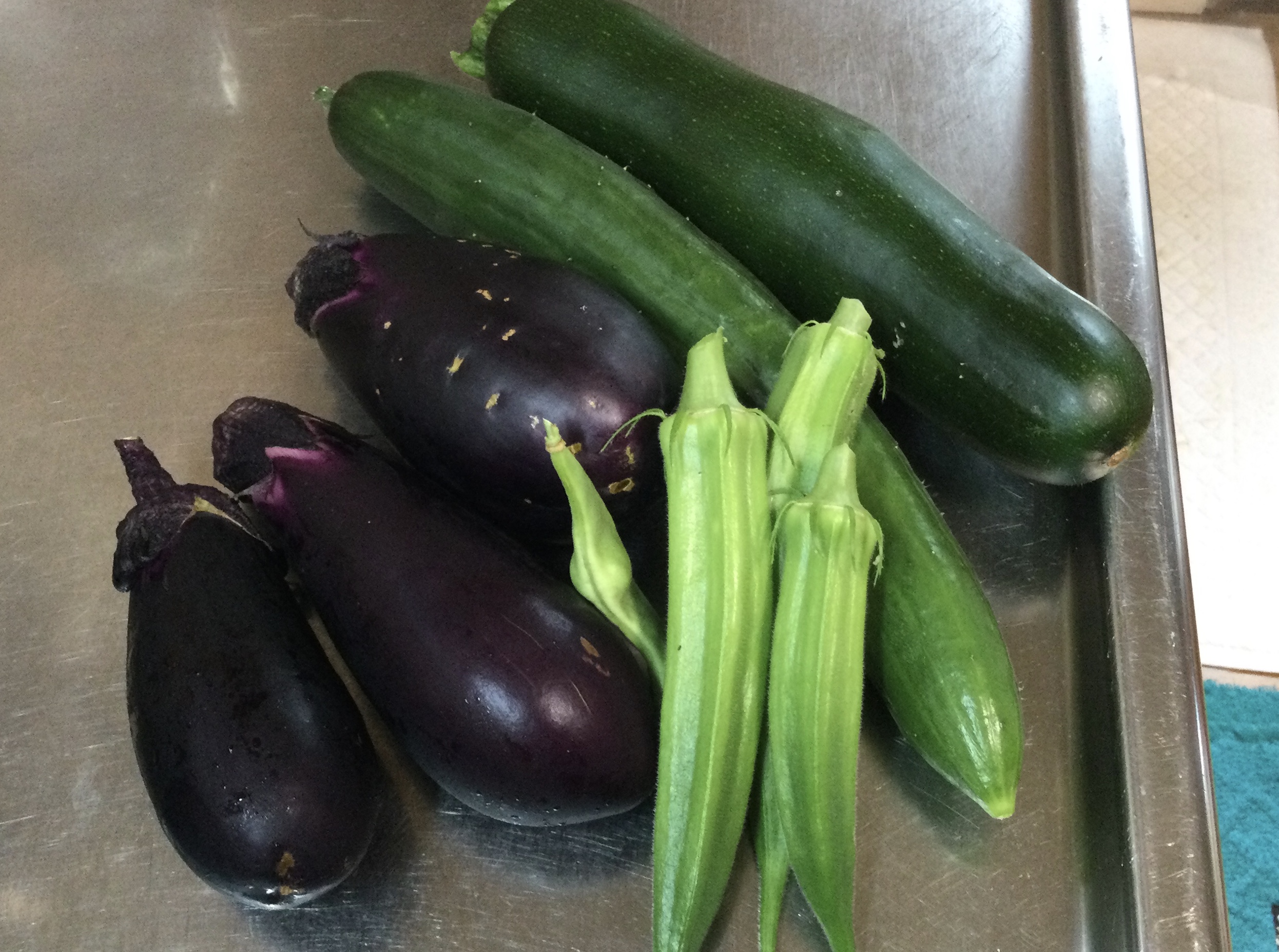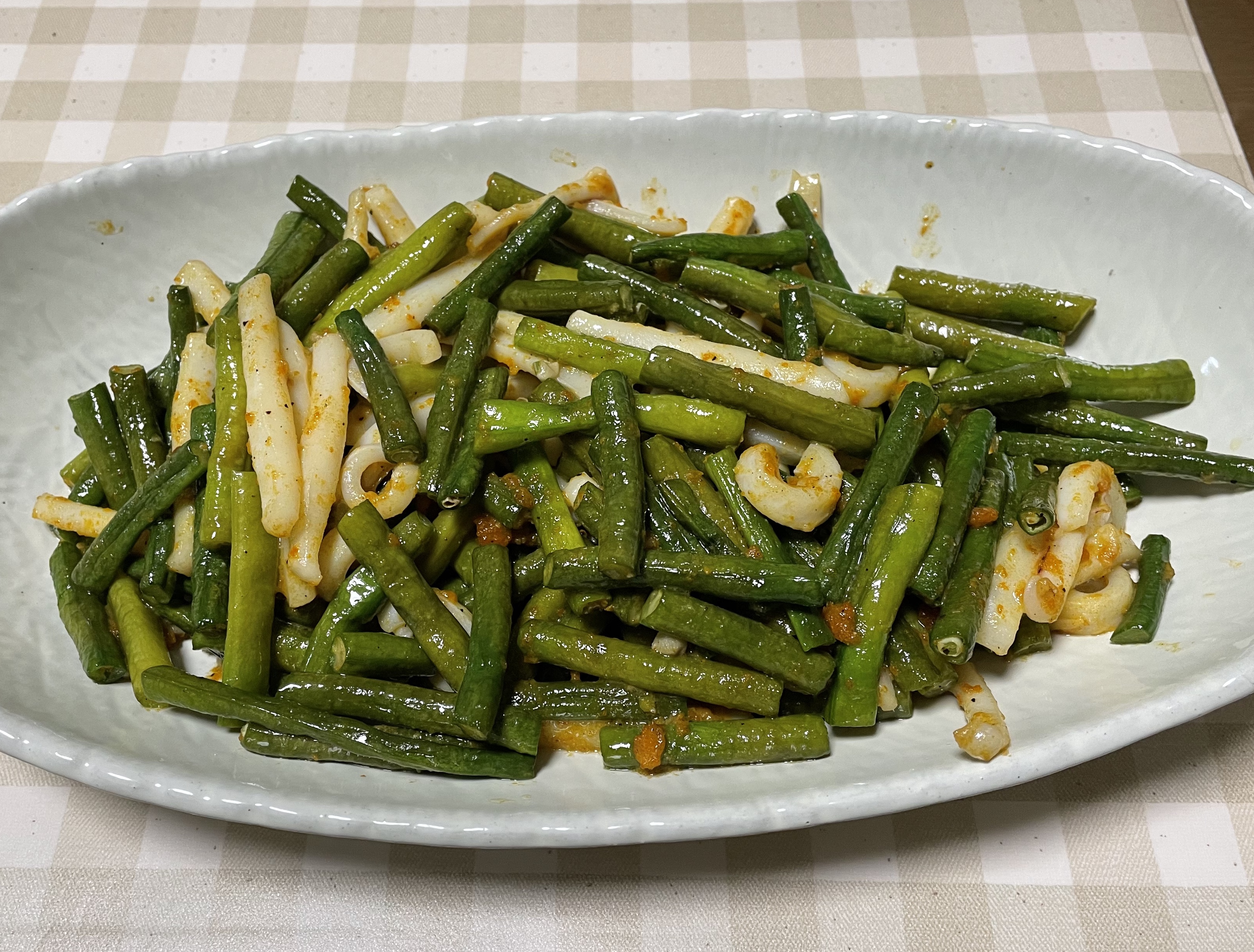 おかずは、我が家の農園で採れた三尺ささげとイカを、バター醤油と塩ウニで炒めました。