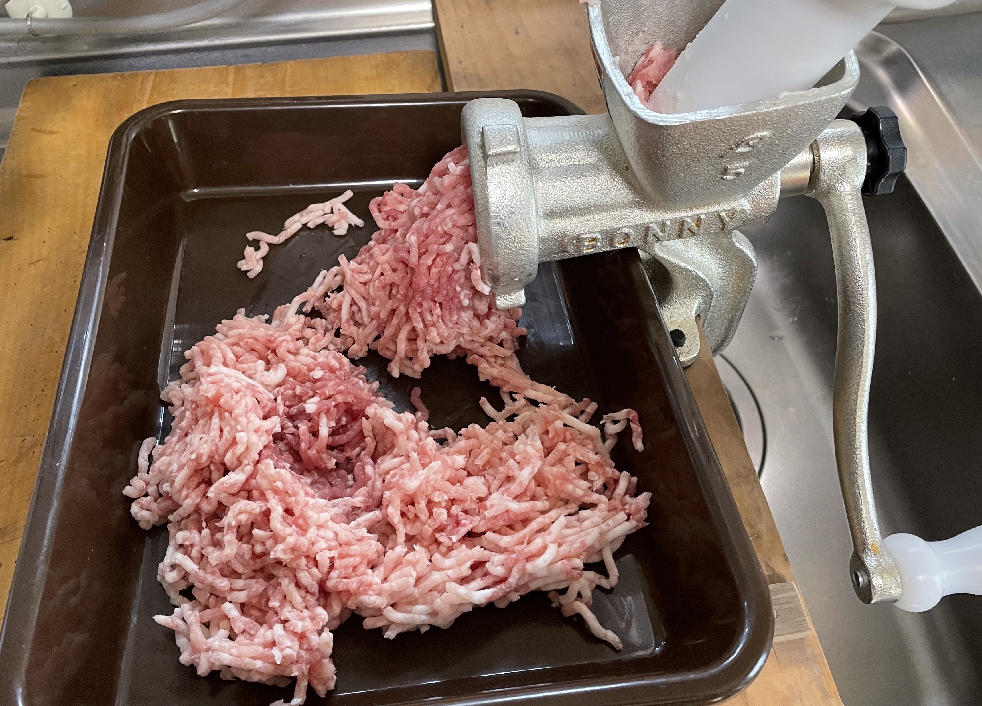 先ずは、温度を15℃以下に保ちつつ肉と脂をミンチにして、